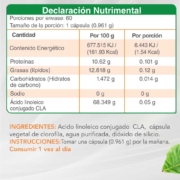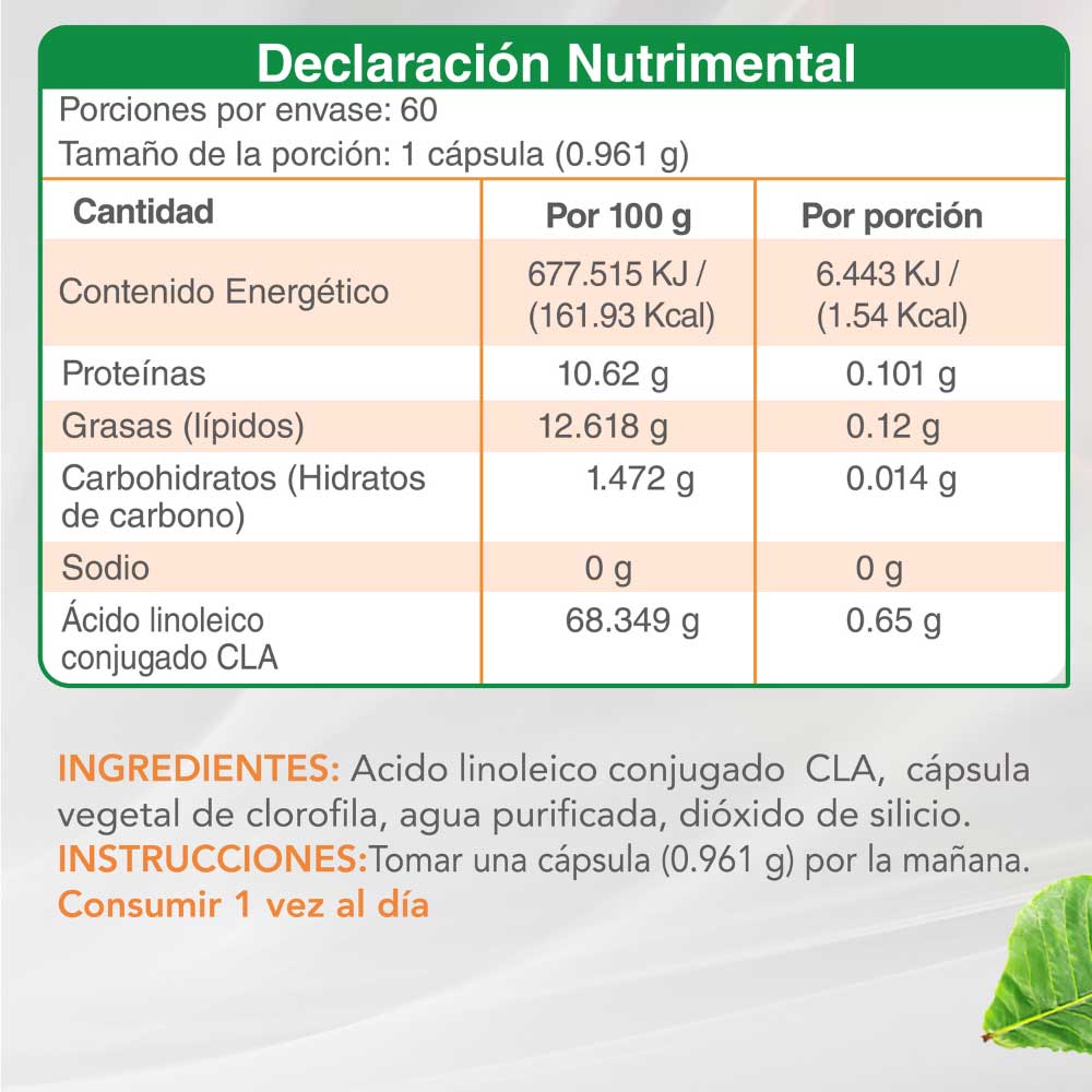 Cada cápsula contiene solo ácido linoleico conjugado en polvo y la cápsula es de clorofila. Sin azúcar. Sin Gluten. Sin colorantes. Sin lácteo. Sin soya