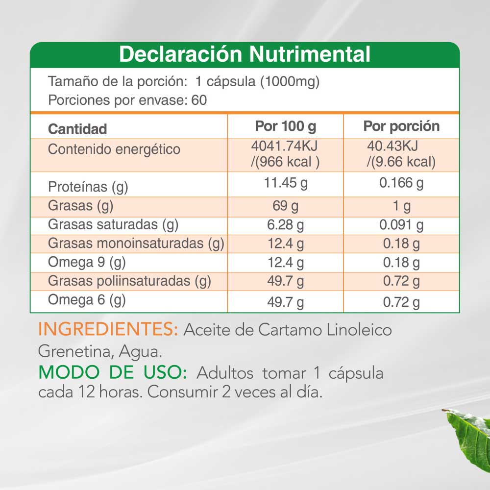 ✅ Ingrediente de origen natural. Cada cápsula contiene 1000 mg de ácido linoleico conjugado extraído de aceite de cártamo.